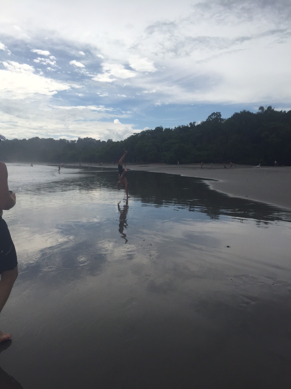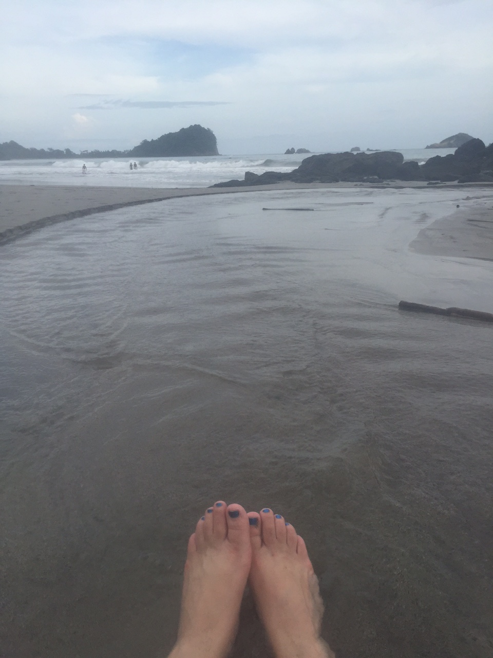 Once we got to the Manuel Antonio National Park, we laid down our blankets and got comfortable. It was somewhat overcast but still really hot, so it didn’t feel like a waste of a beach day at all. I did a little reading, which quickly led to a little napping, and then I headed into the water for a while. It felt so great to be out in the waves. The water was super warm, and I taught the over/under game to a couple of my friends. Being in the ocean helped with the homesickness for sure. Even though it took four hours instead of four minutes to get there, I was so glad to feel the waves and float around for a bit. A friend of mine had this hand paddle thing that he let me try. Basically you put the paddle on your hand (hence the name) and flippers on your feet and try to catch waves. I have never been good at catching waves, but I got one after a few failed attempts. It was fun! After a while, the ocean started getting pretty rough, so I was done.